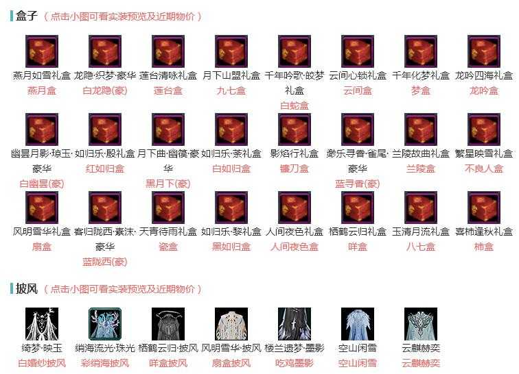 单盒成衣:[三代元宵衣, 红懒猪衣, 灵龙盒衣, 紫沧洲盒衣, 西游盒衣, 青山盒衣, 白幽馥衣替, 游龙盒衣, 婚纱衣, 茄盒衣, 白鹭衣替, 紫月下, 青蛇盒衣, 红上火(替), 绿寻香盒衣, 瑶华盒成衣, 潮涌盒衣, 仙剑衣, 络羽衣]