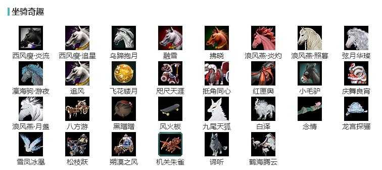 【坐骑】5个[西风瘦炎流, 西风瘦追星, 乌蹄抱月, 弦月马, 瀛海驹游夜]