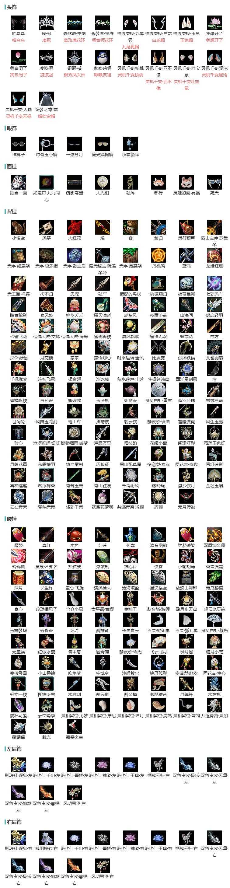 【肩饰】11左,12右,[绝代仙·墨楼·左, 绝代仙·千幻·左, 绝代仙·神姿·左, 绝代仙·玉璃·左, 栖鹤云归·左, 双鱼曳波·极乐·左, 双鱼曳波·无量·左, 双鱼曳波·如意·左, 双鱼曳波·慧福·左, 风明雪华·左][绝代仙·墨楼·右, 绝代仙·千幻·右, 绝代仙·神姿·右, 绝代仙·玉璃·右, 栖鹤云归·右, 风明雪华·右]