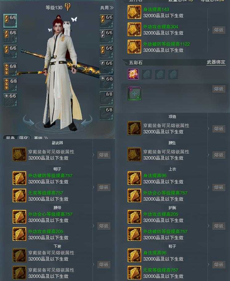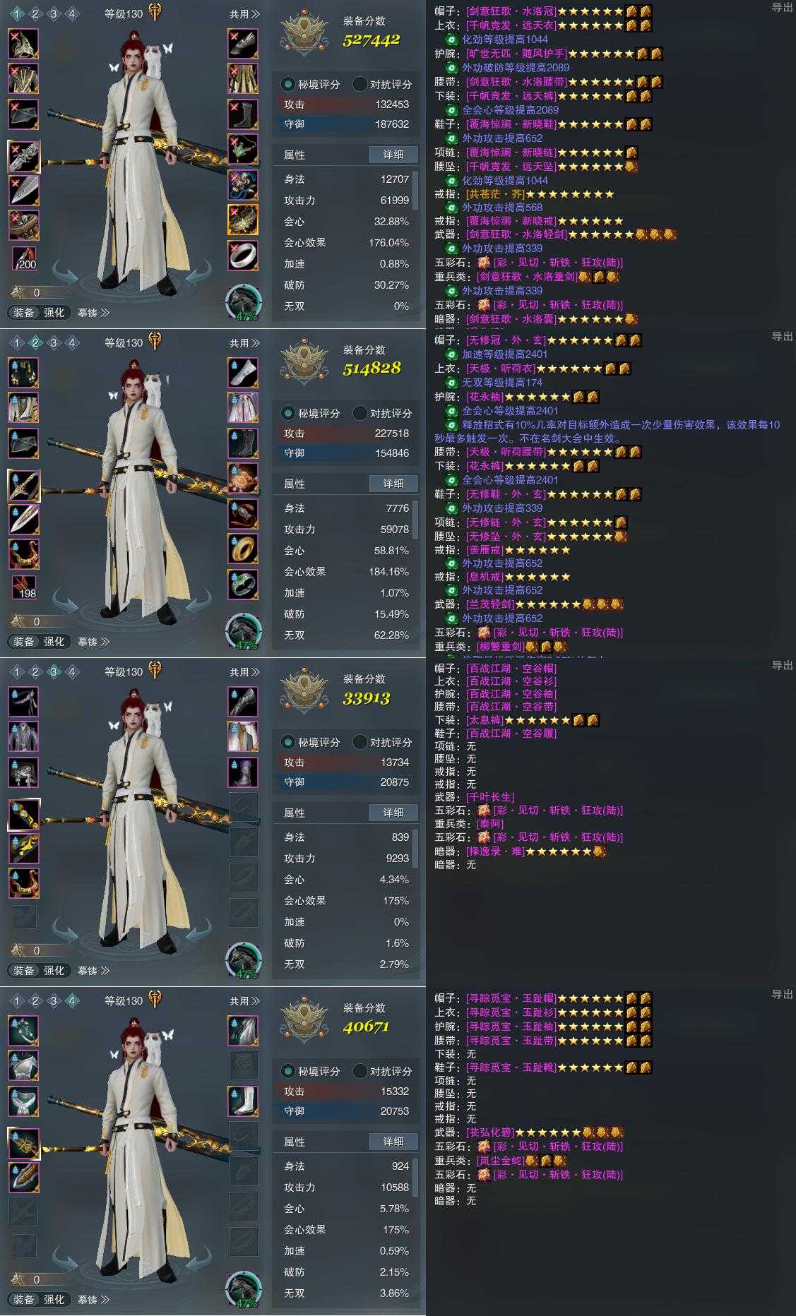 【装备】130级,山居剑意/问水诀PVP527442,山居剑意/问水诀PVE514828,装备三33913,装备四40671