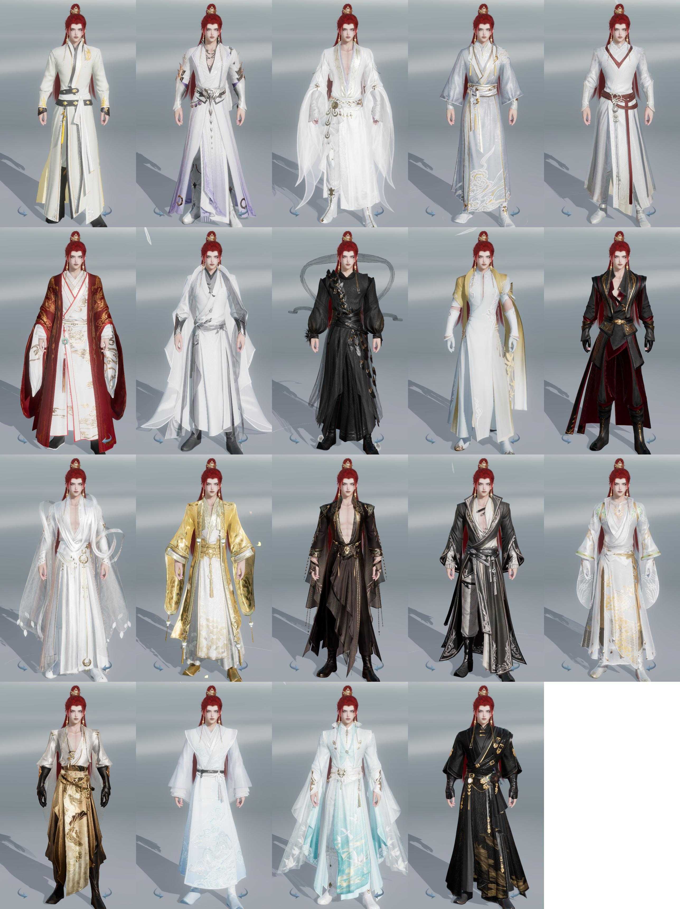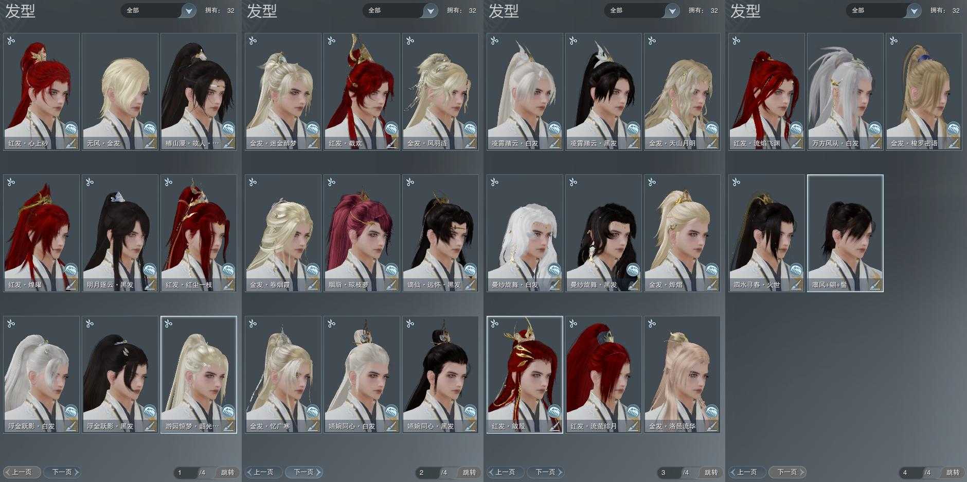 【发型】金发10个[兔金, 资历金, 玫瑰金, 猪金, 丝路金, 角金, 凤金, 牛金, 无风金发, 白游园金发], 红发8个[九红, 十二红, 紫发, 猪红, 牛红, 兔红, 小资历红, 蛇红], 黑发8个, 白发5个, 盒子发型[丝路黑, 狄仁杰黑, 四代七夕黑发, 黑谪仙黑发, 丝路白, 踏云白发, 四代七夕白发, 小金龙黑发, 小金龙白发, 蝴蝶黑发, 黑椿山黑发], 总页数4