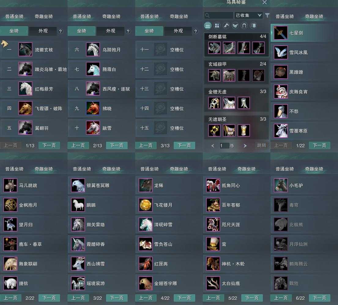 【坐骑】10个[踏炎霸地, 西风瘦逐狱, 飞霞骠破阵, 乌蹄抱月, 黑马, 红马]