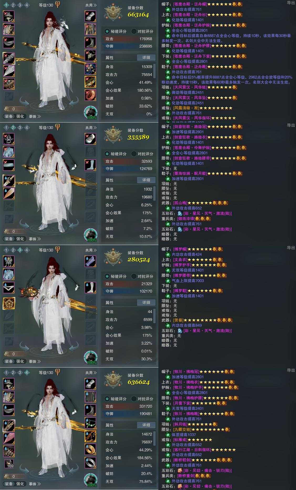 【装备】130级,山居剑意/问水诀PVP663164,装备二355589,装备三280524,山居剑意/问水诀PVE636624
