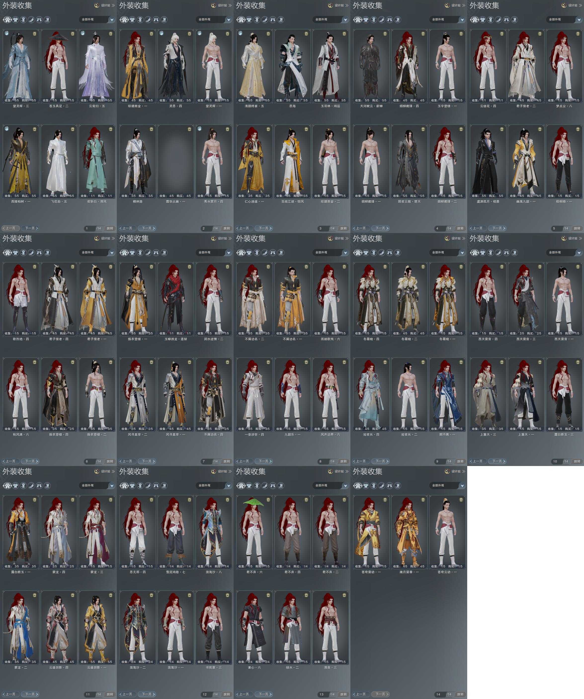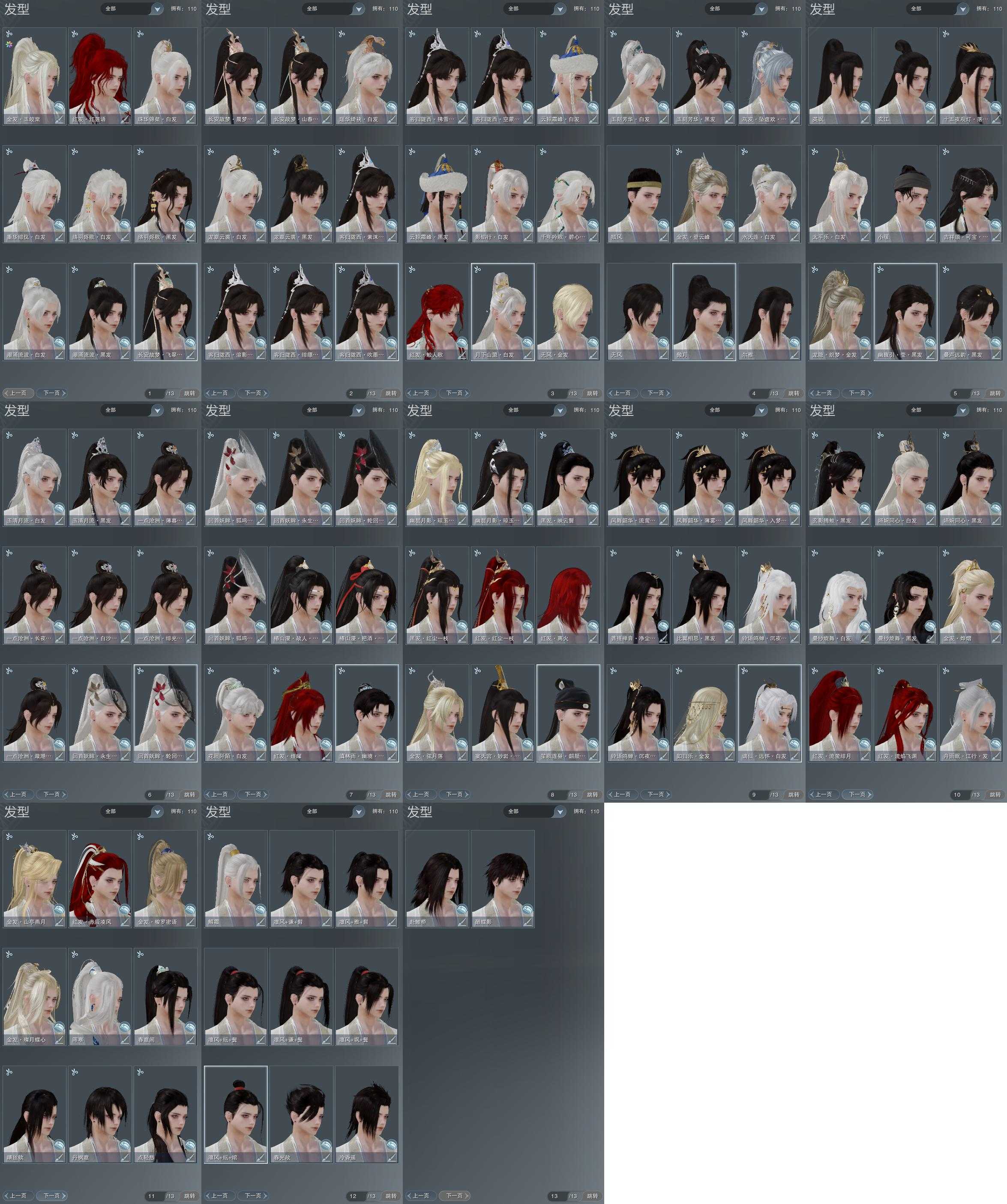 【发型】金发11个[狐金, 资历金, 国金, 猪金, 如归金, 巴卡金, 三代金, 无风金发, 七中金发, 白幽昙金发, 白龙隐金发], 红发9个[八红, 九红, 十二红, 兔红, 小资历红, 大资历红, 十五红, 十六红, 三代灰金], 黑发58个, 白发26个, 盒子发型[丝路黑, 四代七夕黑发, 一代花朝绿白, 小白龙黑发, 黑楼兰黑发, 丝路白, 四代七夕白发, 五代七夕黑发, 黑谪仙白发, 黑楼兰白发, 净尘黑发, 入梦黑发, 薄雾黑发, 流萤黑发, 黑狮黑发, 唐风韶颜白发, 十二黑, 白幽昙黑发, 黑傣族黑发, 红椿山黑发, 黑椿山黑发, 红白妖眸盒黑发, 红黑妖眸盒黑发, 棕黑妖眸盒黑发, 蓝沧洲盒黑发, 粉沧洲盒黑发, 踏青白发, 紫沧洲盒黑发, 黑沧洲盒黑发, 黄沧洲盒黑发, 红白妖眸盒白发, 红黑妖眸盒白发, 棕黑妖眸盒白发, 八七盒黑发, 白幽馥黑发, 八七盒白发, 黑藏袍黑发, 红观灯盒黑发, 九七白发, 青蛇盒白发, 云掠霜峰黑发, 镰刀白发, 彩陇西黑发, 粉陇西黑发, 白陇西黑发, 蓝陇西黑发, 灰陇西黑发, 紫陇西黑发, 墨龙盒黑发, 云掠霜峰白发, 蓝故梦黑发, 紫故梦黑发, 绿故梦黑发, 墨龙盒白发, 瑶华盒白发, 潮涌盒黑发, 络羽黑发, 潮涌盒白发, 络羽白发], 总页数13