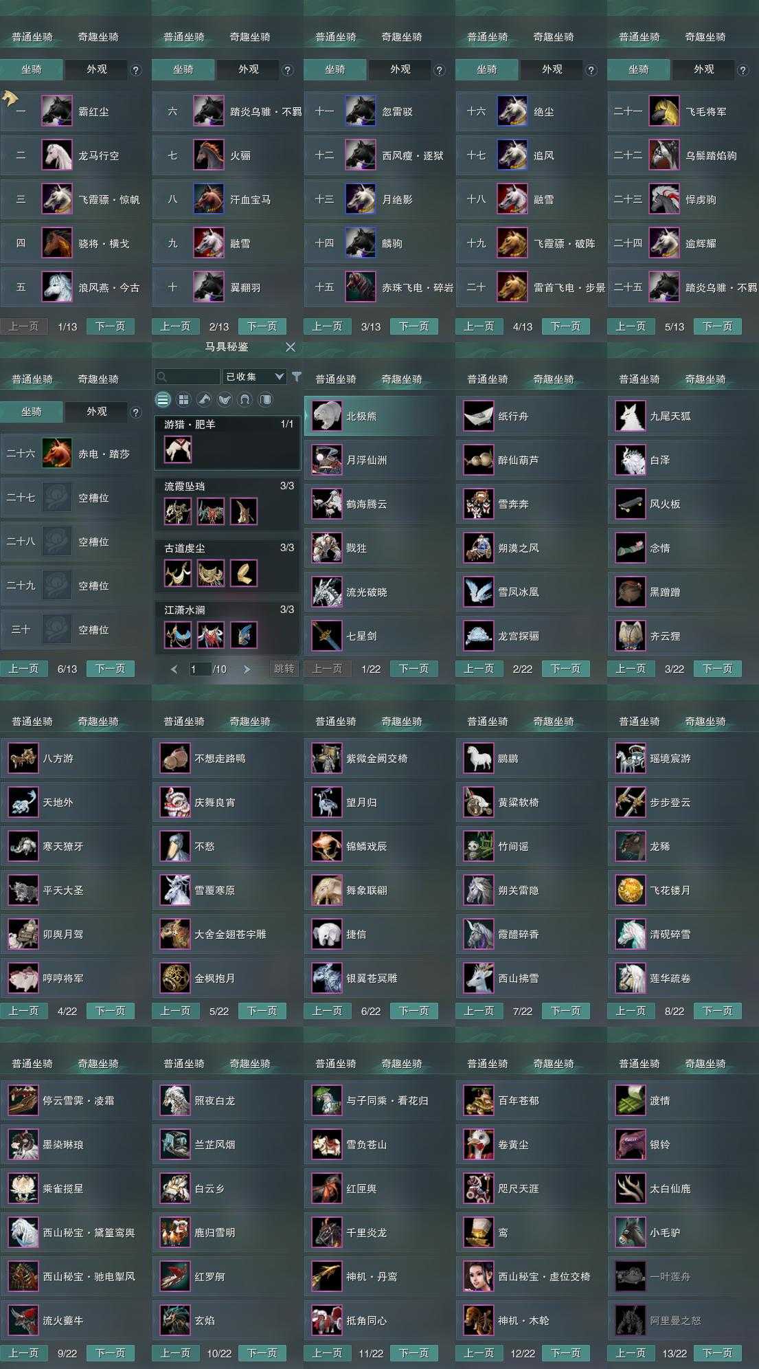 【坐骑】26个[绝尘, 踏炎不羁, 踏炎不羁, 西风瘦逐狱, 赤珠碎岩, 飞霞骠惊帆, 飞毛将军, 飞霞骠破阵, 白龙马, 浪风燕今古, 骁将横戈, 霸红尘, 雷首飞电步景, 乌鬃踏焰驹]