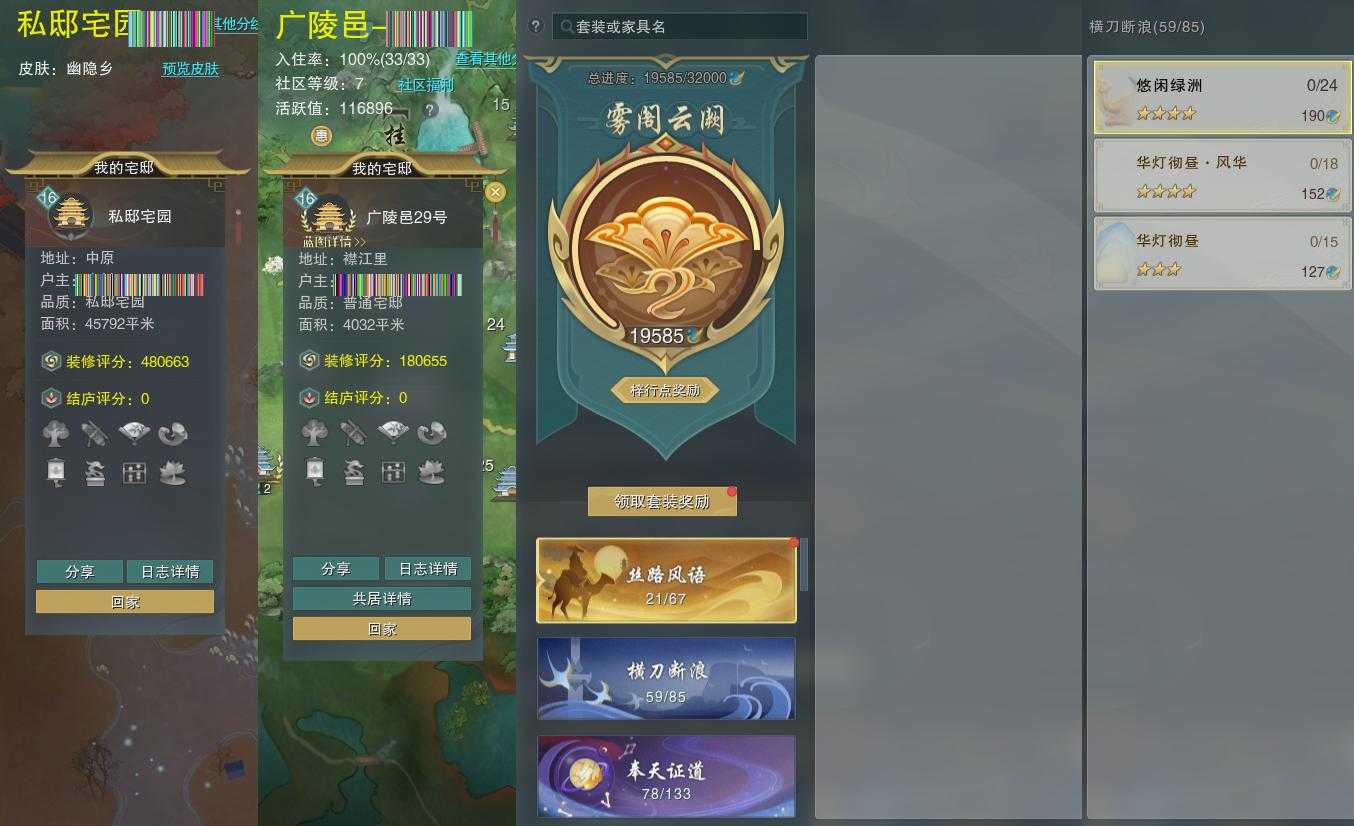 【家园】房屋等级16,社区等级7,私邸宅园,梓行点19585