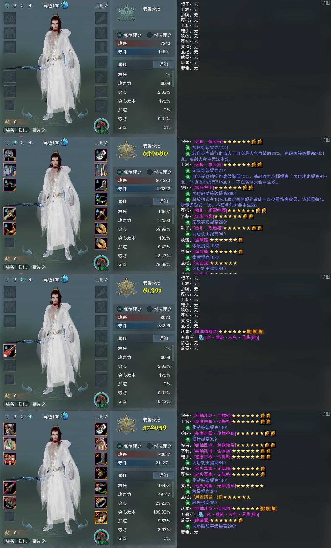 【装备】130级,装备一0,紫霞功PVE639680,装备三81391,紫霞功PVP572059