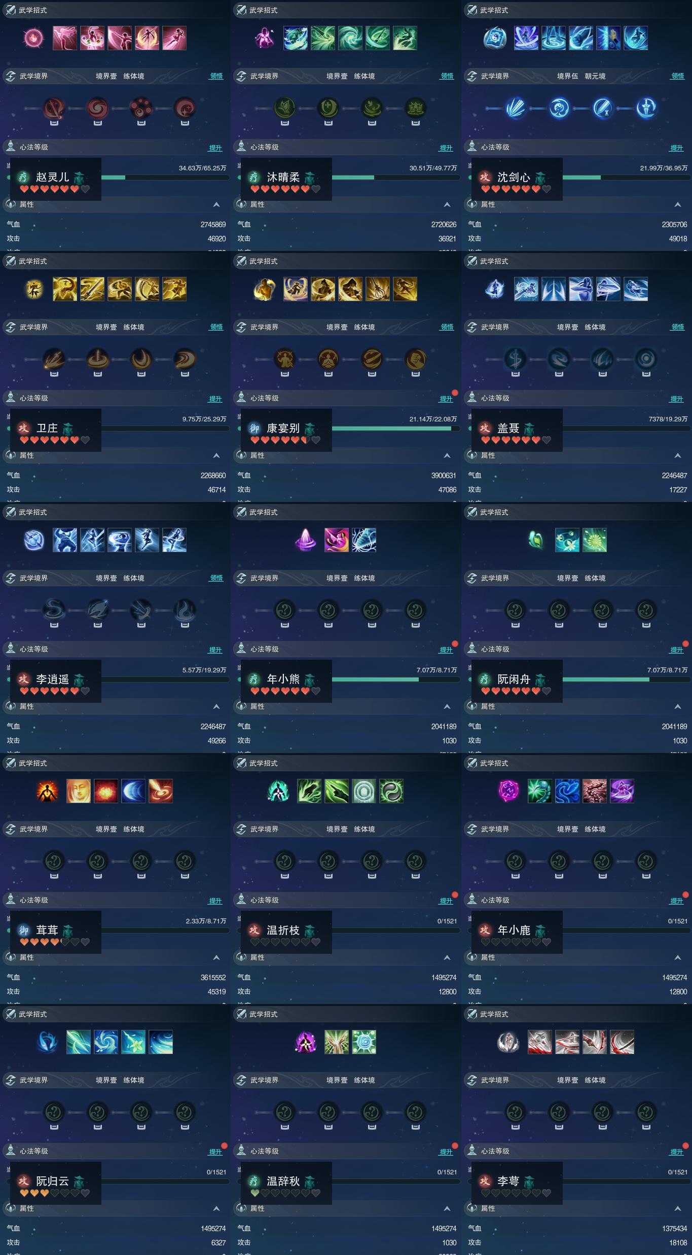 【同伴】赵灵儿81级境界壹,沐晴柔79级境界壹,沈剑心78级境界伍,卫庄志74级境界壹,康宴别73级境界壹,盖聂志72级境界壹,李逍遥72级境界壹,年小熊66级境界壹,阮闲舟66级境界壹,茸茸志66级境界壹,温折枝1级境界壹,年小鹿1级境界壹,阮归云1级境界壹,温辞秋1级境界壹,李萼志1级境界壹