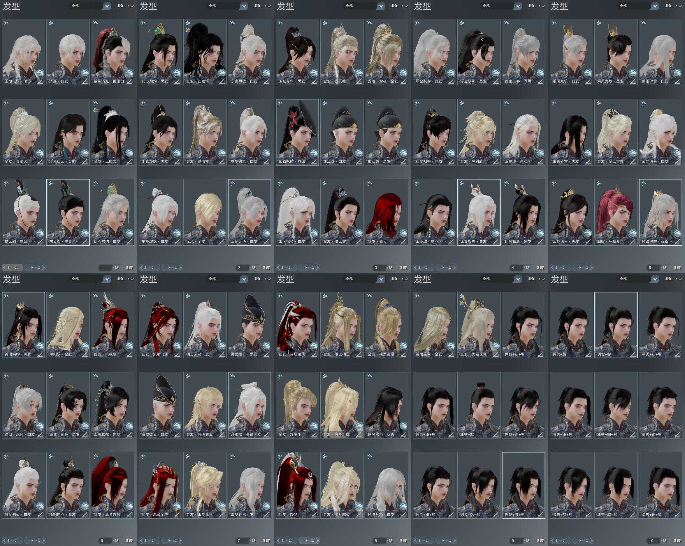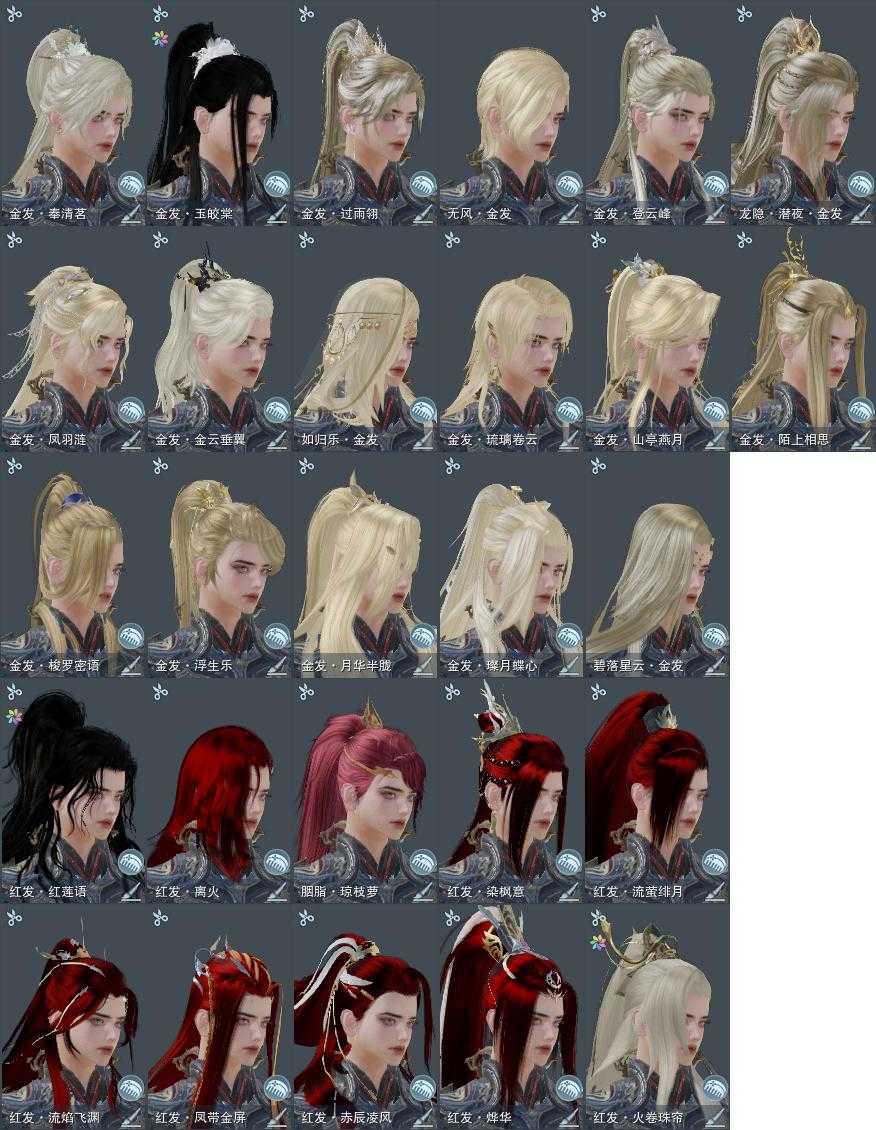 【发型】金发17个[狐金, 资历金, 鸡金, 喵金, 考金, 国金, 苏金, 龙女金, 苍金, 如归金, 凤金, 三代金, 无风金发, 翎金, 七中金发, 金发奉清茗, 黑龙隐金发], 红发10个[六红, 七红, 八红, 九红, 紫发, 狗红, 鼠红, 小资历红, 大资历红, 十六红], 黑发22个, 白发25个, 盒子发型[曲江游白发, 狄仁杰黑, 二代七夕白, 一代花朝白白, 四代七夕黑发, 小白龙黑发, 黑谪仙黑发, 狄仁杰白, 三代七夕白, 黑楼兰黑发, 四代七夕白发, 飞皇黑发, 幽阑黑发, 二代乘风黑发, 五代七夕黑发, 黑谪仙白发, 墨心黑发, 黑楼兰白发, 飞皇白发, 幽阑白发, 二代乘风白发, 五代七夕白发, 墨心白发, 黑红尘黑发, 小金龙黑发, 黑红尘白发, 小金龙白发, 曲江游黑发, 幽涧愀兮白发, 红黑妖眸盒黑发, 傀儡黑发, 傀儡白发, 十七黑发, 黑战国黑发, 十七白发, 黑浮光黑发, 黑战国白发, 白波期白发], 总页数10