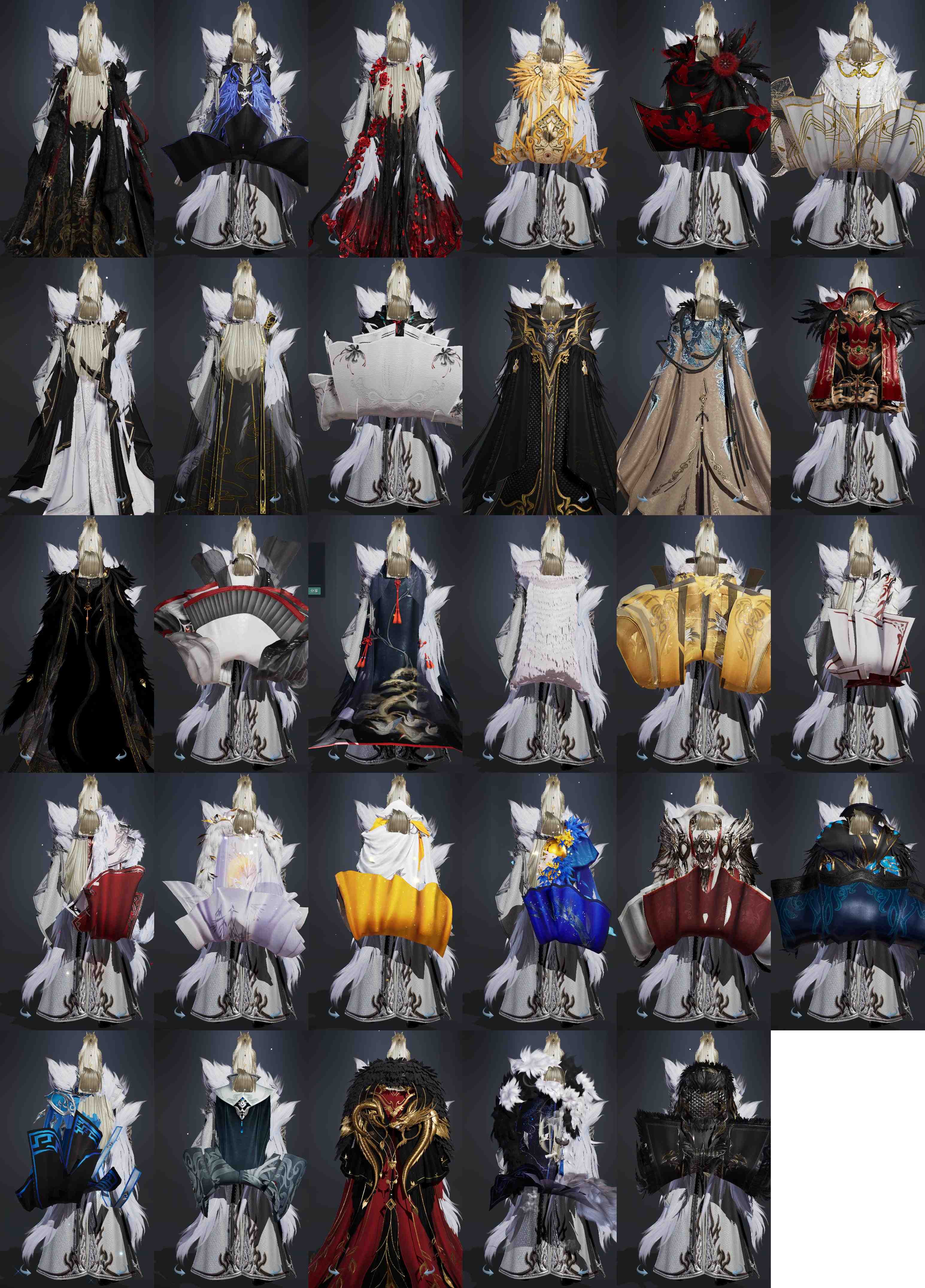 复刻:[策马良宵, 望月欢心, 黑潇湘, 沧海间缥缈, 策马雪月, 罗姆婵娟, 彩云归落雪, 彩云归素青, 白贺华岁, 瑶池春枝, 瑶池暮风, 复刻白二娃, 榆塞斩芒, 夜斩白暮长, 彩云归若霞, 风华远黛, 尽奏映妆, 五期福袋成衣]