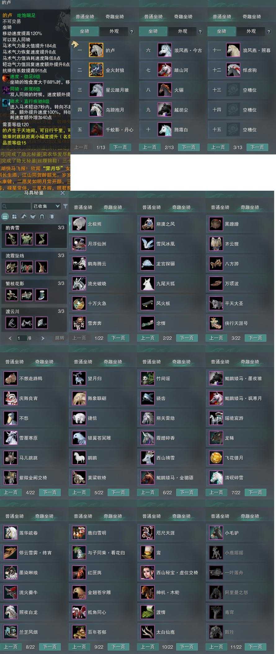 【坐骑】12个[的卢, 阵营狼, 星云踏月骓, 乌蹄抱月, 千蛟影丹心, 浪风燕今古]