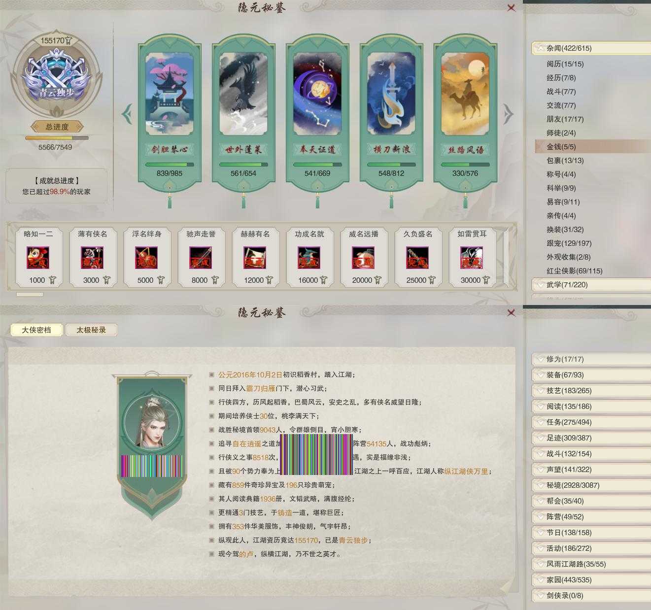 【同伴】唐小珂87级境界伍,沐晴柔84级境界伍,月嘉禾84级境界伍,沈剑心82级境界伍,贺闲志82级境界伍,白鹊志81级境界伍,卫庄志81级境界伍,李星云80级境界伍,康宴别76级境界伍,温辞秋75级境界壹,阮闲舟74级境界壹,盖聂志72级境界伍,年小熊69级境界壹,茸茸志67级境界壹,温折枝60级境界壹,年小鹿60级境界壹,阮归云1级境界壹,燕子娘1级境界壹,李逍遥1级境界伍,李萼志1级境界壹