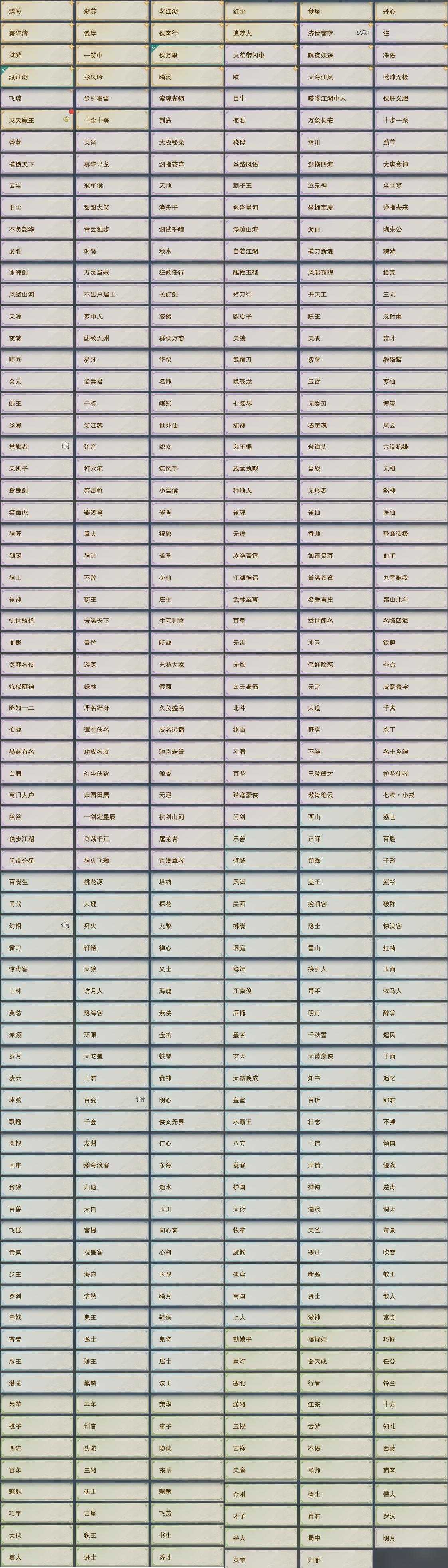【称号】[济世菩萨, 纵江湖, 侠万里, 步引霜雷]