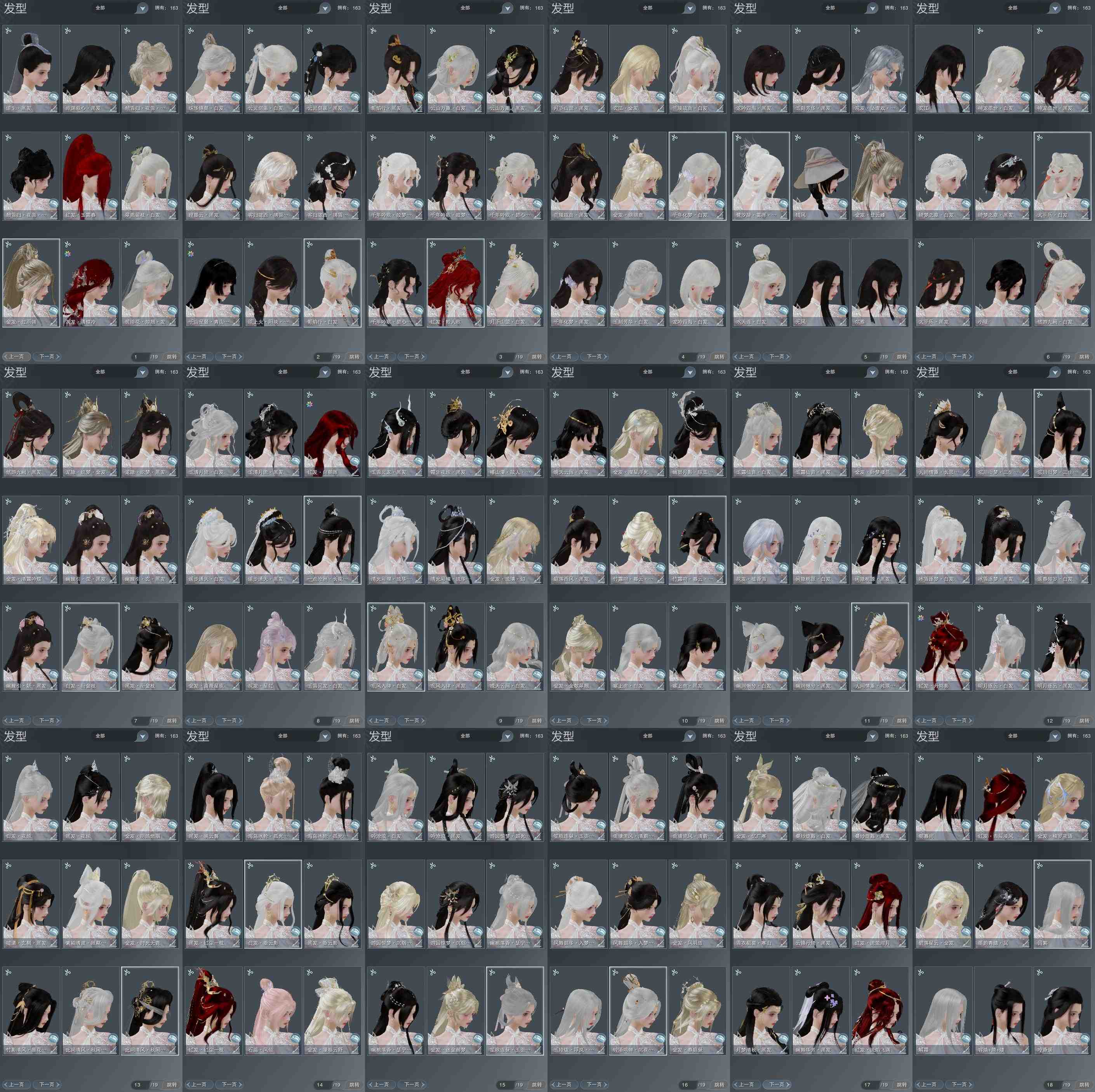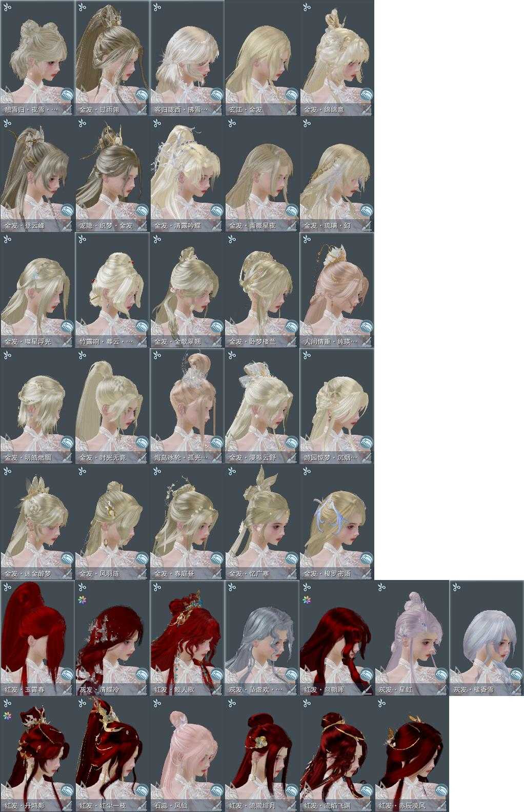 【发型】金发25个[兔金, 资历金, 鼠金, 凤金, 时光金, 牛金, 云金, 双十二金发, 女仆金, 四代中秋金, 雪金, 海金, 蔷薇金, 水母金, 三代金, 咩金, 玄江金发, 翎金, 绿游园金发, 白海岛金发, 紫人间金发, 竹露响暮云金发, 白龙隐金发, 白陇西金发, 粉毛衣金发], 红发13个[八红, 九红, 十二红, 十四红, 凤仙粉, 蝶粉, 虎红, 小资历红, 十五红, 马红, 二代灰, 一代灰, 三代灰银], 黑发76个, 白发48个, 盒子发型[丝路黑, 丝路白, 黑楼兰白发, 入梦黑发, 蓝曲塘黑, 浮岚白发, 唐风玉壶黑发, 入梦白发, 绿游园黑发, 蓝曲塘白, 原色幽香黑发, 唐风玉壶白发, 新白游园黑, 竹笛黑发, 原色幽香白发, 十二黑, 白海岛黑发, 竹笛白发, 竹影墨花黑发, 原色异域黑发, 蓝水袖黑发, 黑懒猪黑发, 蝴蝶黑发, 原色异域白发, 花滑黑发, 蓝水袖白发, 粉忘川黑发, 绿人间黑发, 蝴蝶白发, 红梅盒白发, 花滑白发, 粉忘川白发, 山海黑发, 竹露响暮云黑发, 山海白发, 白幽昙黑发, 幽涧愀兮白发, 除夕盒黑发, 蓝钻石盒黑发, 黑椿山黑发, 除夕盒白发, 蓝钻石盒白发, 灵龙盒黑发, 黑沧洲盒黑发, 西游盒黑发, 灵龙白发, 八七盒黑发, 白幽馥黑发, 紫幽馥黑发, 西游盒白发, 黑幽馥黑发, 白龙隐黑发, 八七盒白发, 游龙盒黑发, 婚纱盒黑发, 游龙盒白发, 熊猫黑发, 婚纱盒白发, 龙吟盒黑发, 梦盒黑发, 兰陵盒黑发, 熊猫白发, 九七黑发, 白鹭白发, 青蛇盒黑发, 白蛇盒黑发, 镰刀黑发, 龙吟盒白发, 梦盒白发, 兰陵盒白发, 黄上火黑发, 绿千山黑发, 九七白发, 青蛇盒白发, 白蛇盒白发, 镰刀白发, 白陇西黑发, 仙剑黑发, 仙剑白发, 粉毛衣黑发], 总页数18