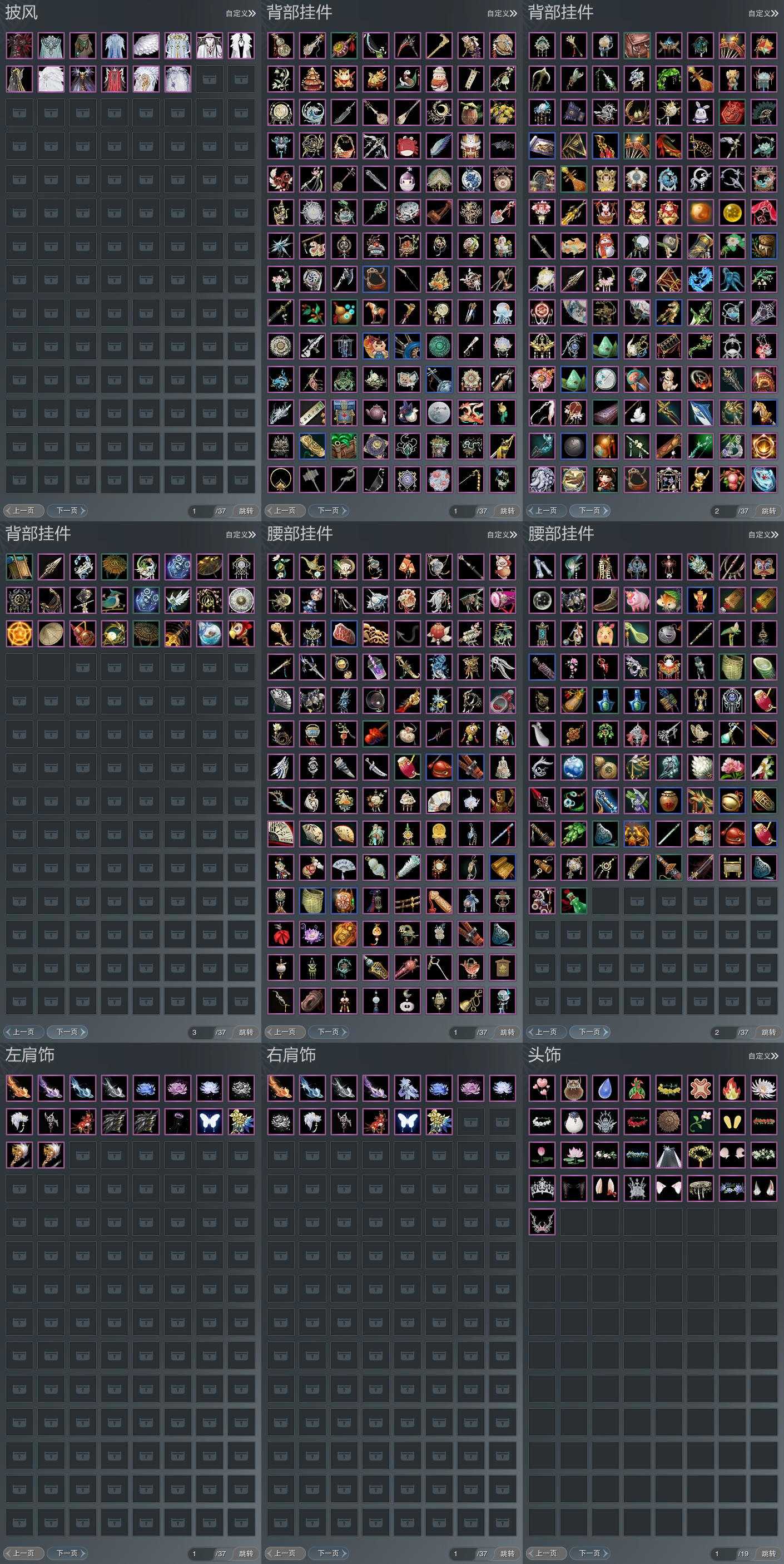 【披风】14个,[7W资历披风, 刀宗预热披风, 一代战令披风, 情R枕, 三山披风, 奇遇披风, 策二披风, 灵狐披风, 玉鸾雪, 星河玄梦, 二代战令披风, 空山闲雪, 云麒赫奕]