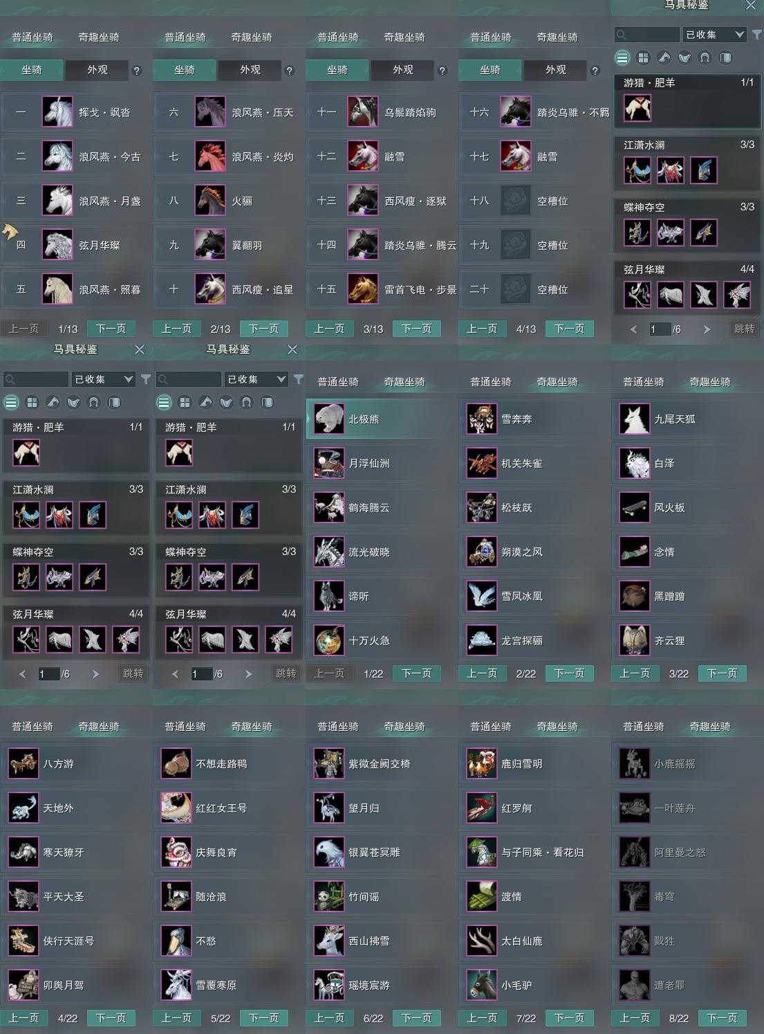 【坐骑】17个[踏炎不羁, 踏炎腾云, 西风瘦逐狱, 西风瘦追星, 弦月马, 挥戈飒沓, 浪风燕今古, 雷首飞电步景, 乌鬃踏焰驹]