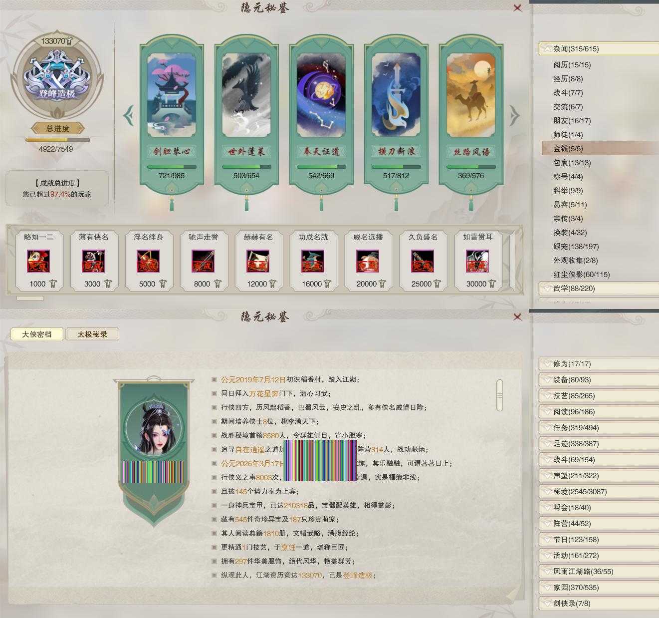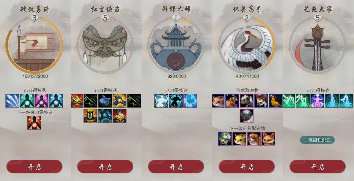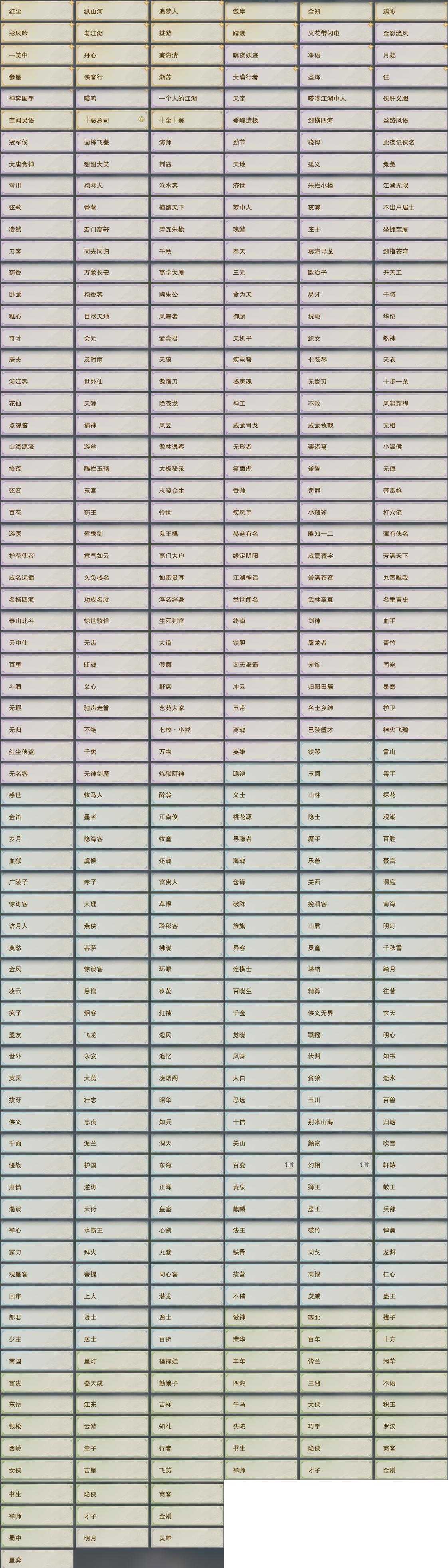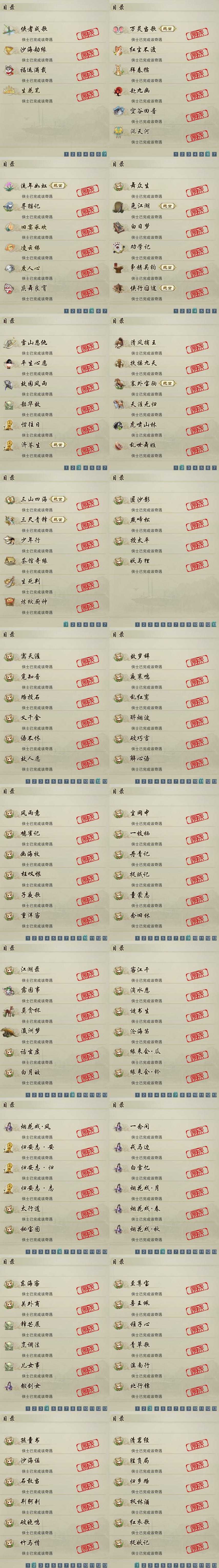 【奇遇】40个[白日梦, 天涯无归, 三山四海, 劝学记, 雪山恩仇, 兔江湖, 平生心愿, 惜往日, 塞外宝驹, 乱世舞姬, 争铸吴钩, 韶华故, 虎啸山林, 济苍生, 少年行, 故园风雨, 扶摇九天, 三尺青锋, 流年如虹, 舞众生, 清风捕王, 寻猫记, 侠行囧途, 茶馆奇缘, 万灵当歌, 庆舞良宵, 生死判, 凌云梯, 炼狱厨神, 赴九幽]