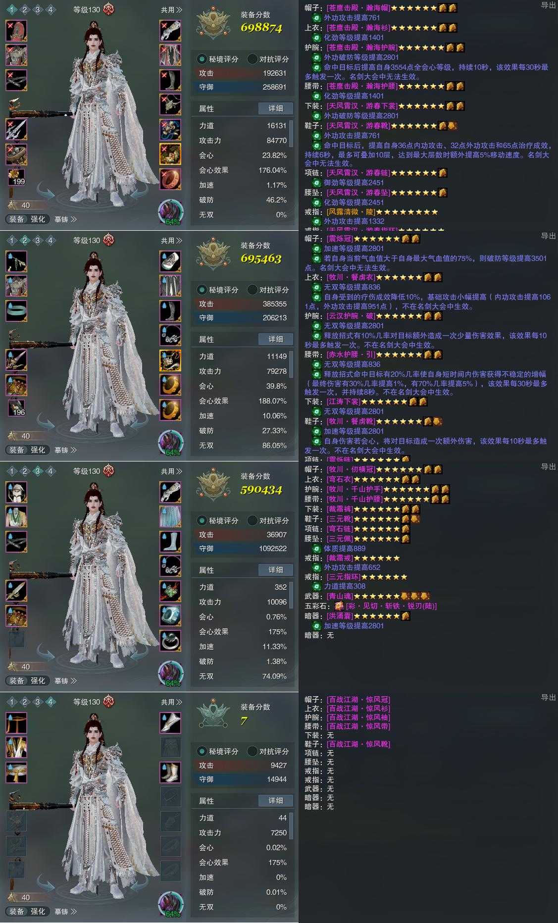 【装备】130级,傲血战意PVP698874,傲血战意PVE695463,铁牢律PVE590434,装备四7