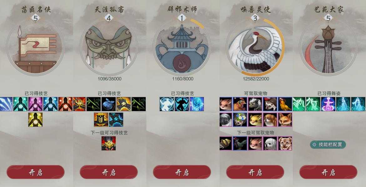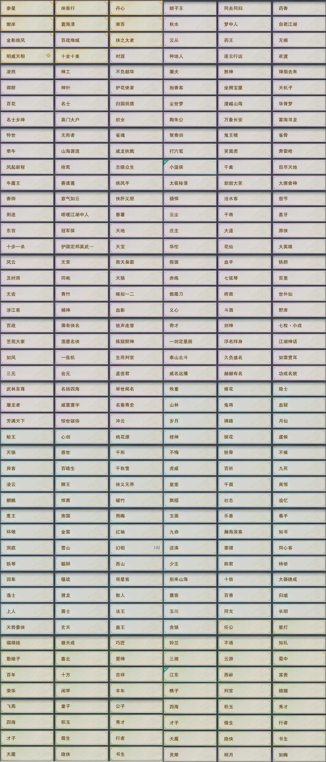 【奇遇】24个[天涯无归, 雪山恩仇, 平生心愿, 惜往日, 乱世舞姬, 韶华故, 虎啸山林, 护佑苍生, 少年行, 故园风雨, 扶摇九天, 舞众生, 流年如虹, 清风捕王, 侠行囧途, 寻猫记, 庆舞良宵, 生死判, 凌云梯, 炼狱厨神, 度人心, 旧宴承欢, 泛天河, 拜春擂]